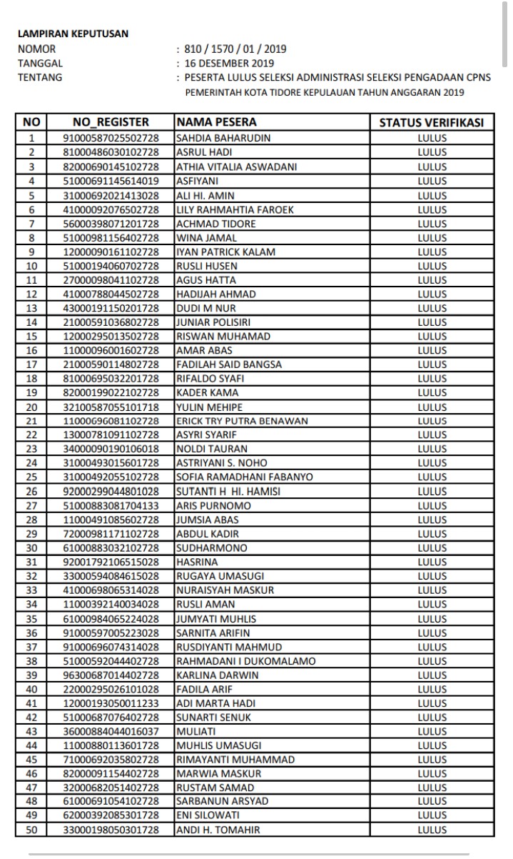 Ini Hasil Pengumuman Berkas Seleksi CPNS Kota Tidore Kepulauan Tahun 2019 Minggu, 15 Desember 2019Minggu, 15 Desember 2019oleh redaksi-1778 Dilihatoleh redaksi Data lengkap. Klik (unduh dokumen) Post Views: 1.778 Jangan LewatkanSebanyak 57 peserta CPNS Kota Tidore Kepulauan ikuti Seleksi Kompetensi DasarKabar Gembira, Pemkot Tidore resmi Buka Seleksi PPPK di Kota Tidore KepulauanBKD Mulai Lakukan Evaluasi dan Observasi Terhadap Calon PPPKHasil Pelaksanaan Test Seleksi Kompetensi Dasar (SKD) Calon Pegawai Negeri Sipil (CPNS) Kota Tidore Kepulauan Tahun 2020 SuksesSudah 137 Orang Capai Passing Grade, Alokasi Formasi CPNS Tidore 110