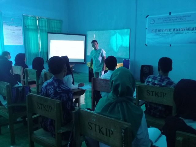 Pelatihan yang berlangsung pagi tadi dimulai pada jam 9.00 sampai 4.00 Wit seore di ruang belajar Kampus STKIP, Prodi Pendidikan Bahasa dan Sastra Indonesia di STKIP Kie Raha Ternate dengan mengusung tema, “Membangun Kemampuan Kewirausahaan dan Kepustakawan Berbasis Teknologi”. Yang langsun menghadirkan dua pemateri diantaranya Iswadi Ahmad, M.Pd dan Kepala Perpustakaan STKIP Kie Raha Yuslina Nuryadin, MA.