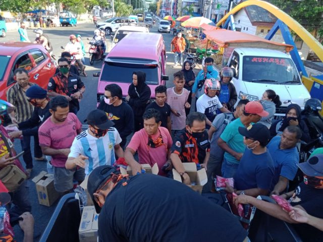 TERNATE – Upayah melakukan pencegahan kasus pandemi Corona virus di wilayah Maluku Utara (Malut), Majelis Pengurus wilayah Pemuda Pancasila (MPW -PP) Malut, melakukan pembagian Masker untuk pedagang di pasar Higienis Kota Ternate, Jumat (10/4/20).