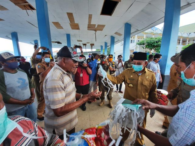 TERNATE – Gubernur Maluku Utara, Abdul Gani Kasuba melakukan penyerahan bantuan secara langsung kepada Nelayan di Pelabuhan Perikanan Dufa-Dufa, Senin (20/4/20).