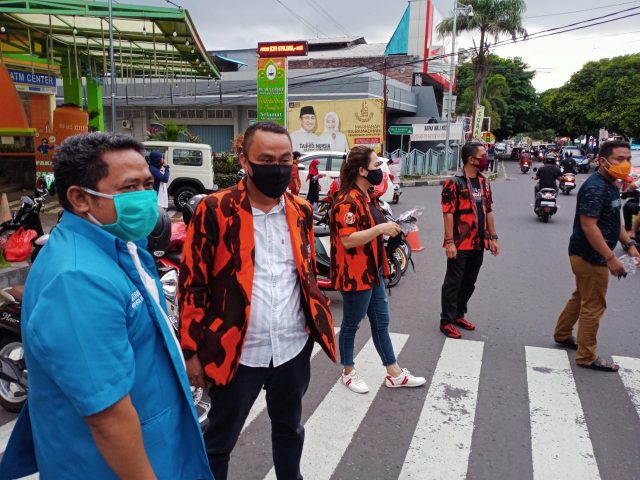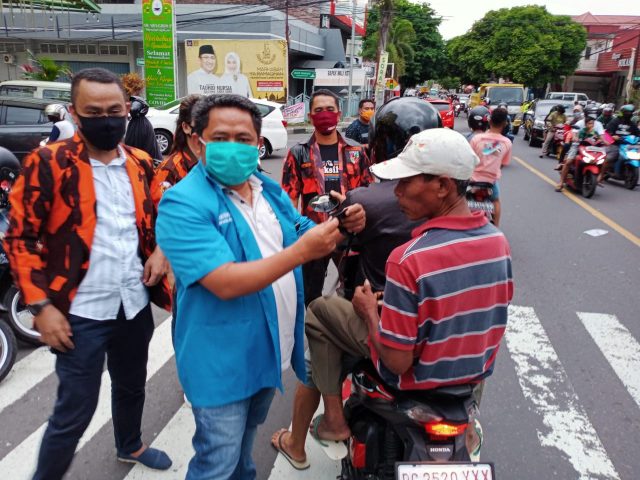 TERNATE – Wakil Ketua Umum DPP KNPI Santrani MS. Abusama yang juga Ketua MPW Pemuda Pancasila Maluku Utara, didampingi Wakil Ketua MPW Iskandar Idrus, bersama pengurus MPW Pemuda Pancasila Malut dan MPC Pemuda Pancasila Kota Ternate membagikan masker dan handsanitizer gratis kepada pengendara dan masyarakat dibeberapa titik di Kota Ternate, diantaranya Pasar Barito, Jatiland Mall, Ternate Mall dan beberapa titik lainnya, Minggu (31/05/2020).