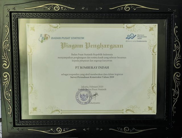 Piagam Penghargaan dari Kepala Badan Pusat Statistik diserahkan oleh Kepala BPS Kabupaten Fakfak, Cahyo Kristiono, SST, M.Stat kepada Direktur PT.Bomberay Indah, Andrew Asdi Harsiawan pada hari Jumat, 17 Juli 2020 di Kantor PT.Bomberay Indah, Jalan Izak Telussa Fakfak.