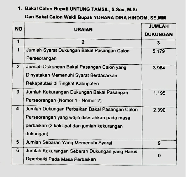 1). Bakal Calon Bupati UNTUNG TAMSIL, S. Sos., M.Si dan Bakal Calon Wakil Bupati YOHANA DINA HINDOM, SE, MM.