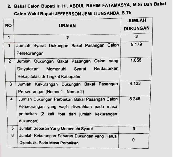 2). Bakal Calon Bupati lr. Hi. ABDUL RAHIM FATAMASYA. M.Si dan Bakal Calon Wakil Bupati JEFFERSON JEMI LIUNSANDA, S.Th