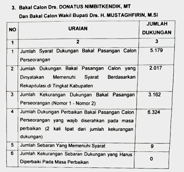 3). Bakal Calon Bupati Drs. DONATUS NIMBITKENDIK. MT dan Bakal Calon Wakil Bupati Drs. H. MUSTAGHFIRIN. M.Si