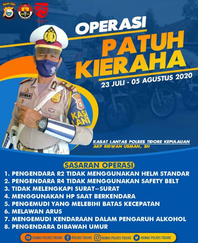 “Operasi dengan sandi Patuh Kie Raha 2020 dilaksanakan sebagai upaya meningkatkan kesadaran dan kepatuhan masyarakat guna mewujudkan Kamseltibcarlantas,”ujar Kapolres saat amanatnya.