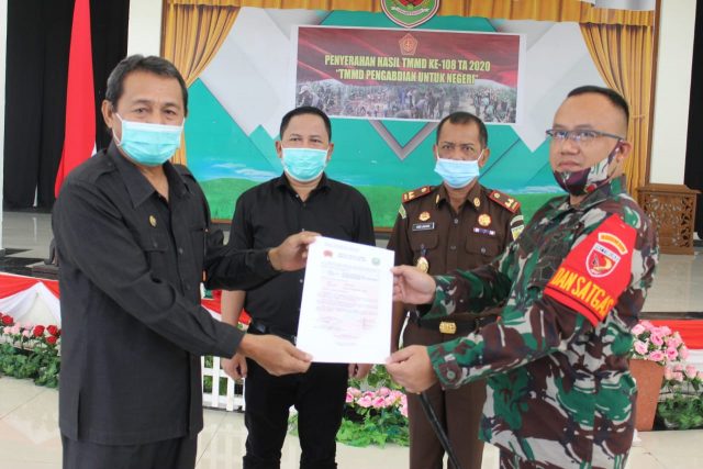 Kegiatan berakhir dengan penandatanganan naskah serah terima hasil kegiatan TMMD ke 108 Kodim 1505/Tidore Tahun 2020 dan foto bersama. (Satgas TMMD 108)