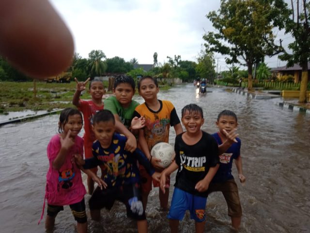 Anak-anak manfaatkan genangan air untuk bermain. (foto by: Nofal)