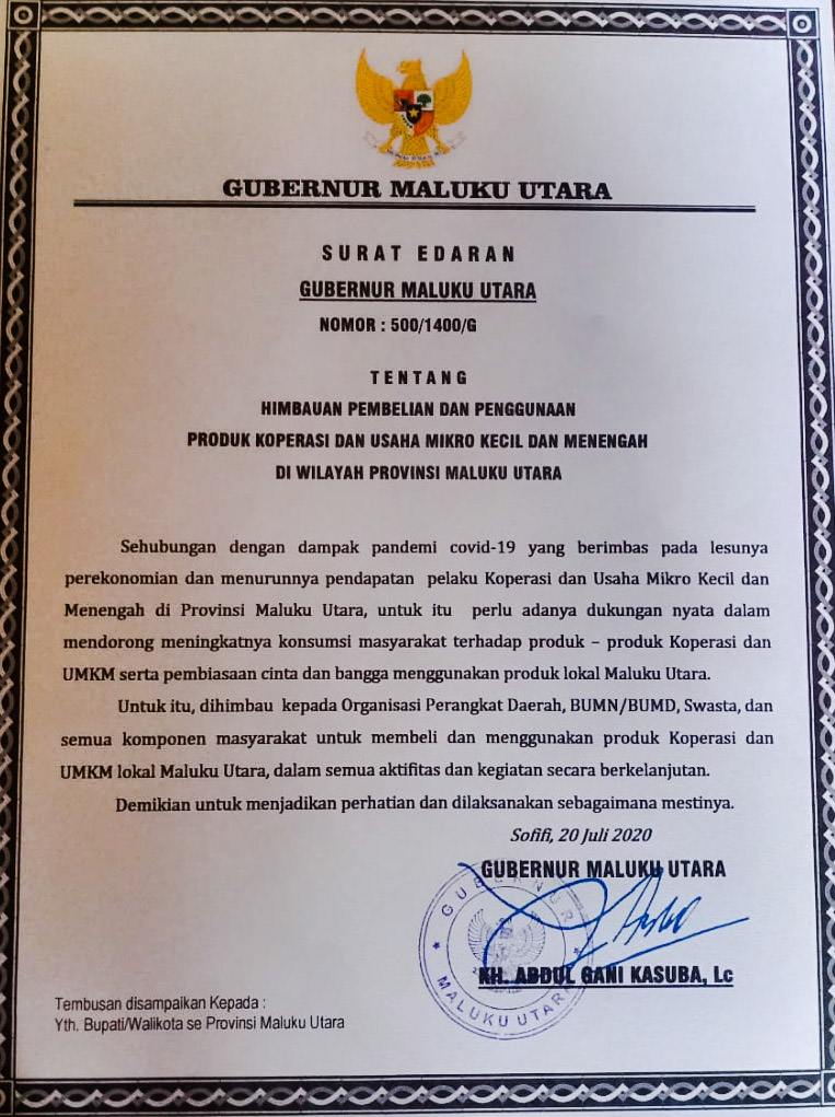 Melalui surat edaran Gubernur Malut Nomor : 500/1400/G tentang Himbauan Pembelian dan Penggunaan Produk Koperasi dan Usaha Mikro Kecil dan Menengah di wilayah  Provinsi Maluku Utara yang diterbitkan di Sofifi pada tanggal