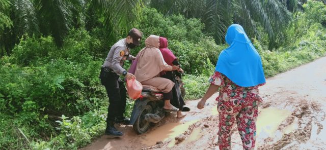 ROKAN HILIR – Kapolsek Kubu Iptu Rudi Sudaryono SIK MM bersama personil Polsek Kubu Bripda Zaiudin Usman melaksanakan kegiatan patroli rutin di Kep. Sei Kubu Kec. Kubu, ketika itu ditemukan Ibu-Ibu dan anaknya yang hampir terjatuh saat melintas karena situasi Jalan licin dan baru selesai turun hujan, Sabtu 15 Agustus 2020.