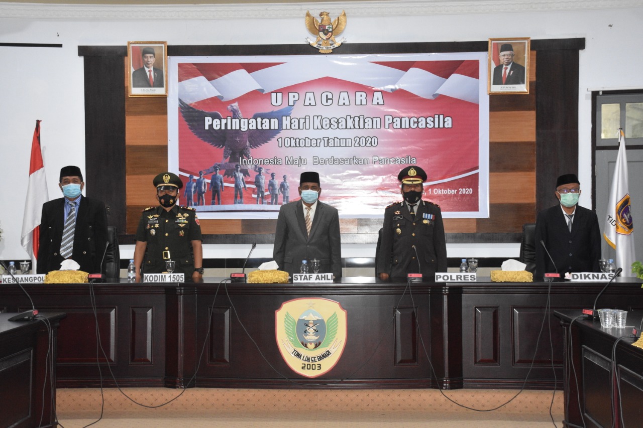 TIDORE KEPULAUAN- Walikota Tidore Kepulauan yang diwakili Staf Ahli Bidang Hukum Politik dan Pemerintahan Jamaluddin Badar mengikuti Upacara Peringatan Hari Kesaktian Pancasila 1 Oktober Tahun 2020 Indonesia Maju Berdasarkan Pancasila yang diselenggarakan secara Virtual.