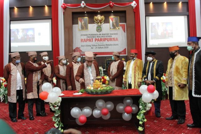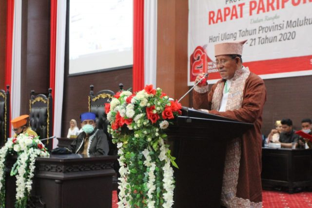 SOFIFI – Usai rayakan HUT Pemprov Malut ke 21 Gubernur KH. Abdul Gani Kasuba lanjut melakukan pidatonya Paripurna Hut Provinsi di ruang paripurna DPRD Provinsi Malut di Sofifi dan disaksikan Ketua DPRD Provinsi Malut Kuntu Daud dan Anggota, Senin (12/10/20).