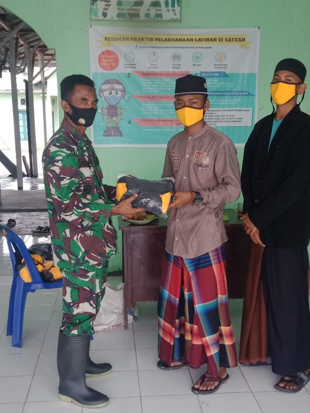 kunjungan itu, Dandim 0321/ Rohil Letkol Arh Agung rachman wahyudi. Sip. Mi. Pol melalui Danramil 04/ Kubu Kapt Inf Alfarisi menyalurkan bantuan berupa 500 buah masker kepada para santri Pondok Pesantren Dar Aswaja Rohil.