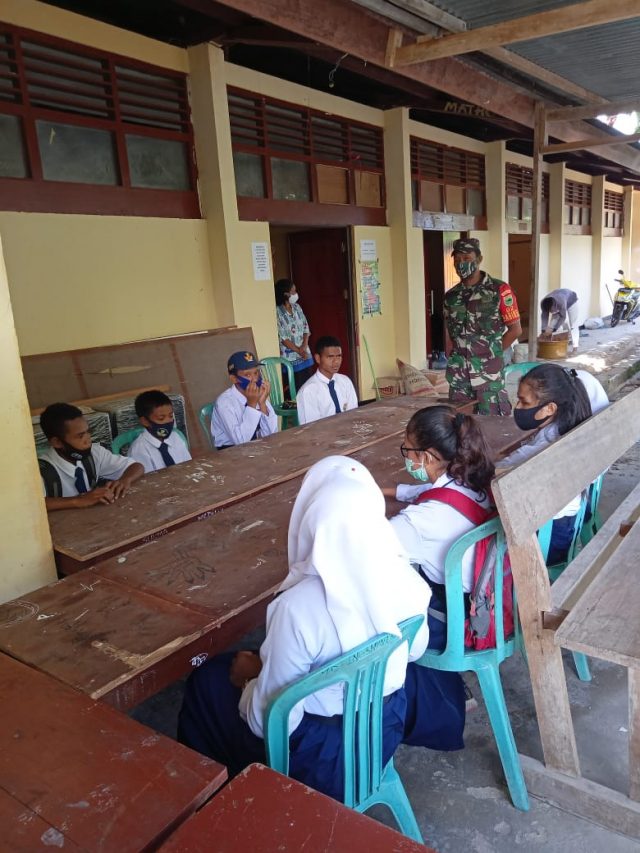 Fakfak – Babinsa Koramil 1803-02/Kokas Kopda Maxmilian Pasaka memberikan materi Wawasan Kebangsaan (Wasbang) kepada Siswa-siswi SMP Negeri 1 Kokas, Kabupaten Fakfak, Papua Barat, Sabtu (31/10/20).