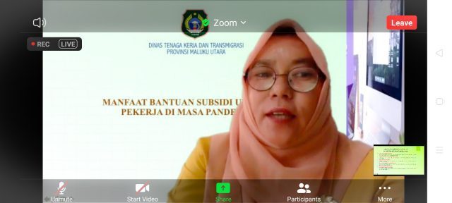 Kemudian beranjak pada sesi berikutnya pada pukul 13:00 wit- 15:00 Wit yang berlangsung dengan tema “Manfaat Bantuan Subsidi Upah (BSU) bagi Pekerja di Masa Pandemi”. Yang juga menghadirkan Kepala Bidang Pelatihan dan Penempatan Kerja Disnakertrans Provinsi Malut, Dra. Irnawati Dahman, M.Si. sebagai narasumber.