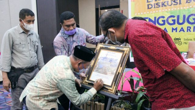 Disela-sela kegiatan Lounching dan Diskusi Buku di lakukan Penandatanganan Cover buku Menggugat negara maritim oleh Wakil Gubernur Provinsi Maluku Utara Dan Penyerahan Plakat Dari Koordinator Presedium Majelis Wilayah KAHMI Maluku Utara Kepada Prof Dr Rokhmin Dahuri, Ms.