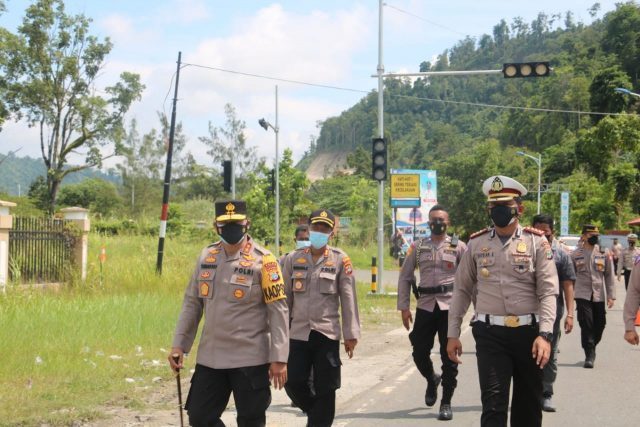FAKFAK – Kapolda Papua Barat Irjen Pol. Dr. Tornagogo Sihombing, S.IK., M.Si didampingi Dirlantas Polda Papua Barat Kombes Pol. Raydian Kokrosono, SIK dan Kapolres Manokwari AKBP Dadang Kurniawan, SIK, meninjau pos penyekatan PPKM Darurat pada Selasa (13/7/2021) yang berlokasi di simpang tiga Jalan Maruni, Manokwari Papua Barat.