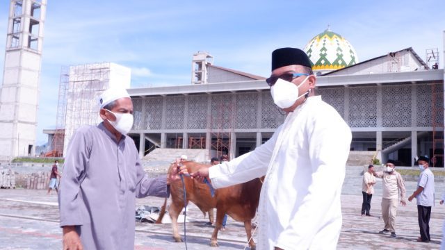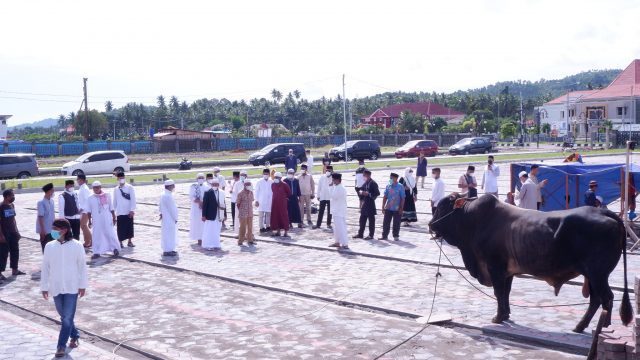 SOFIFI – Gubernur Maluku Utara KH. Abdul Gani Kasuba usai melaksanakan shalat idul adha di mesjid Nurul Hasan kantor gubernur langsung menyerahkan Hewan kurban bantuan presiden dan gubernur kepada masyarakat. Hewan kurban bantuan presiden Republik Indonesia Joko Widodo resmi diserahkan gubernur kepada H. Ade Abu Salam imam mesjid Annur Balisosa, bertempat dihalaman mesjid Raya Sofifi, Selasa (20/7/21).