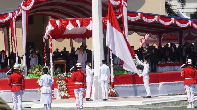 SOFIFI – Walaupun masih seperti tahun kemarin dalam kondisi Pandemi Covid-19, Upacara peringatan detik-detik Proklamasi Kemerdekaan Republik Indonesia dalam rangka HUT RI ke-76 yaang digelar di Halaman Kantor Gubernur, Selasa (17/8/21) berlangsung baik dengan tetap mengikuti protokol Covid-19.