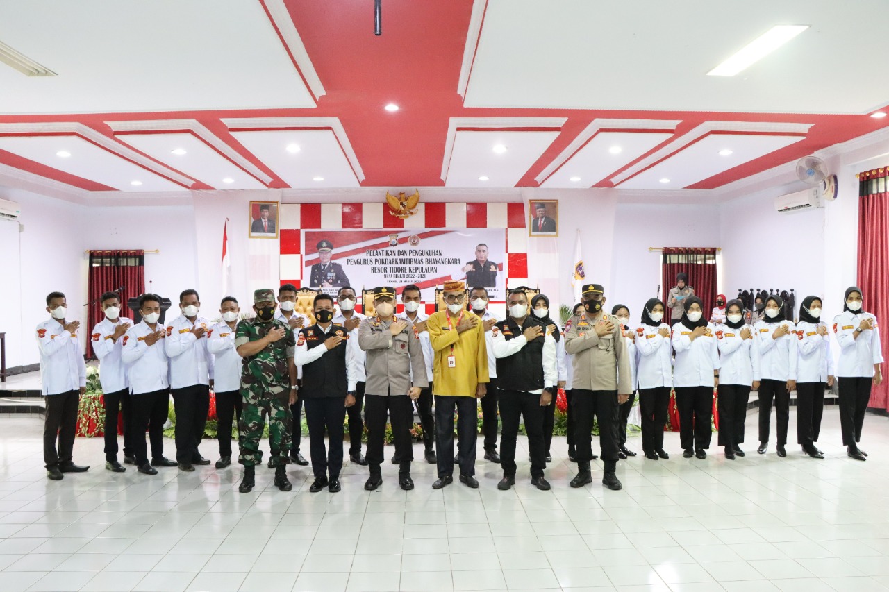 TIDORE – Didampingi Ketua Umum Pengurus Pokdar Kamtibmas Provinsi Maluku Utara (Malut), Salmin I. Saleh, Kapolres Tidore AKBP Yohanes Jalung Siram pimpin upacara pelantikan dan pengukuhan Pokdarkamtibmas Bhayangkara Resor Tidore periode tahun 2022-2026.
