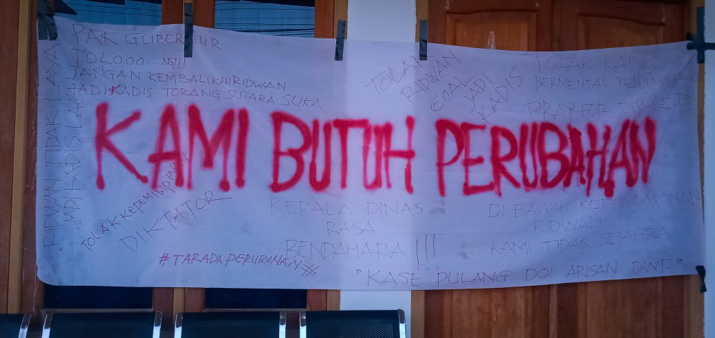 Dimana, pada petisi yang dipasang terdapat tulisan seperti, “Tolak Kadis Bermental Bendahara”, “Kase Pulang Doi Arisan DWP”, dan “Pak Gubernur !!! Tolong jangan kembalikan Ridwan sebagai Kadis, Torang samua Tara suka.”