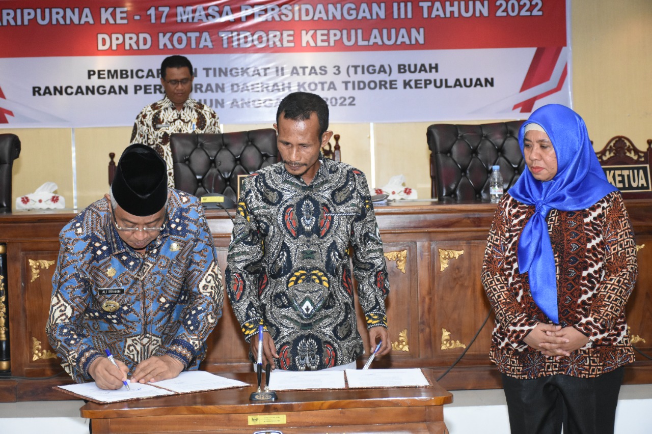 Setelah disetujui dan disahkan oleh DPRD, dilanjutkan dengan penandatangan sekaligus penyerahan keputusan DPRD oleh Ketua DPRD Kota Tidore Ahmad Ishak kepada Wali Kota Tidore Kepulauan Capten H. Ali Ibrahim.