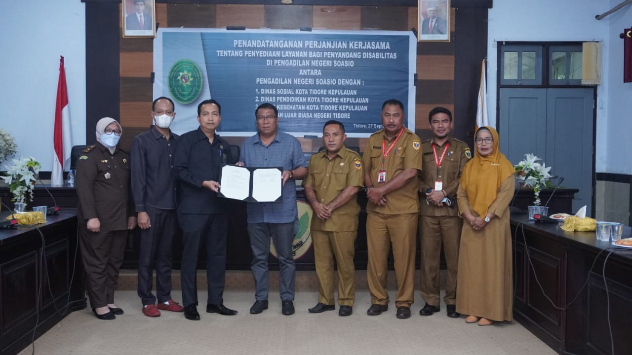 TIDORE – Pemerintah Kota Tidore Kepulauan melalui beberapa Satuan Kerja Perangkat Daerah bersama Pengadilan Negeri Soasio melakukan penandatanganan tentang perjanjian kerjasama bidang penyediaan layanan bagi penyandang disabilitas.