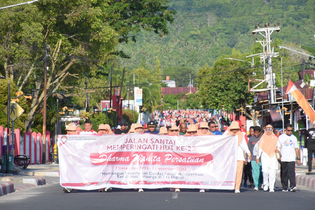 TIDORE – Ratusan orang antusias mengikuti jalan sehat dalam rangka Hari Ulang (HUT) Tahun ke-23 Dharma Wanita Persatuan (DWP), yang dilepas secara resmi oleh Sekretaris Daerah Kota Tidore Kepulauan, di halaman Kantor Walikota Tidore, Minggu (11/12/22).