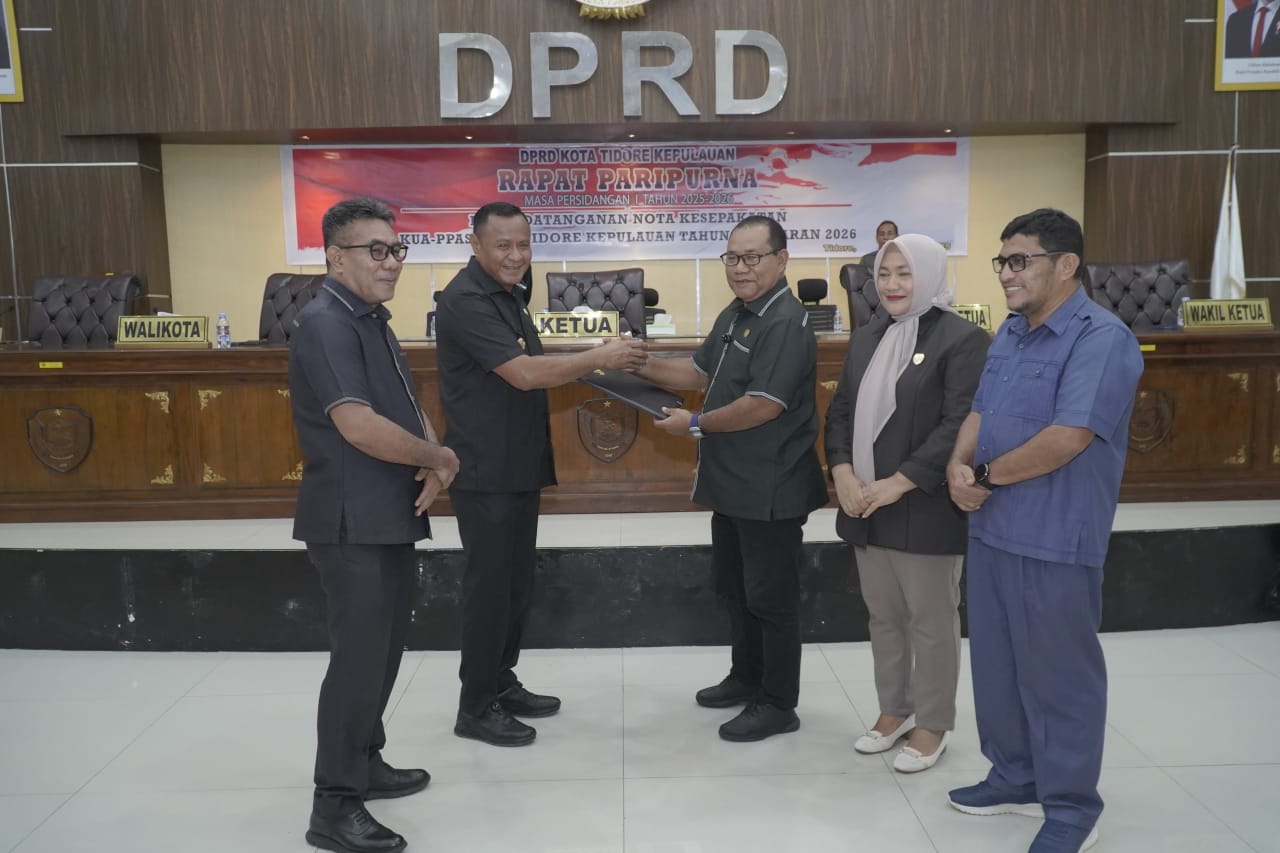 TIDORE – Wali Kota Tidore Kepulauan Muhammad Sinen bersama Wakil Wali Kota Ahmad Laiman dan Pimpinan DPRD Kota Tidore Kepulauan menandatangani Nota Kesepakatan Kebijakan Umum Anggaran (KUA) dan Prioritas Plafon Anggaran Sementara (PPAS) Tahun Anggaran 2026.