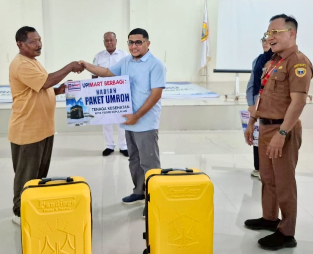 TIDORE — Owner Upimart, H. Ridwan Moh Yamin, bersama istri kembali menunjukkan komitmen dan kepeduliannya kepada tenaga kesehatan dengan menepati janji yang telah disampaikan pada malam Gala Dinner peringatan Hari Kesehatan Nasional (HKN) ke-61 di Aula Nuku 12 November 2026. Janji tersebut diwujudkan melalui penyerahan perlengkapan dua paket umroh kepada tenaga kesehatan di Kota Tidore Kepulauan yang rencana keberangkatannyan pada 11 Januari 2026 dengan dengan menggunakan jasa Fandiego Travel.
