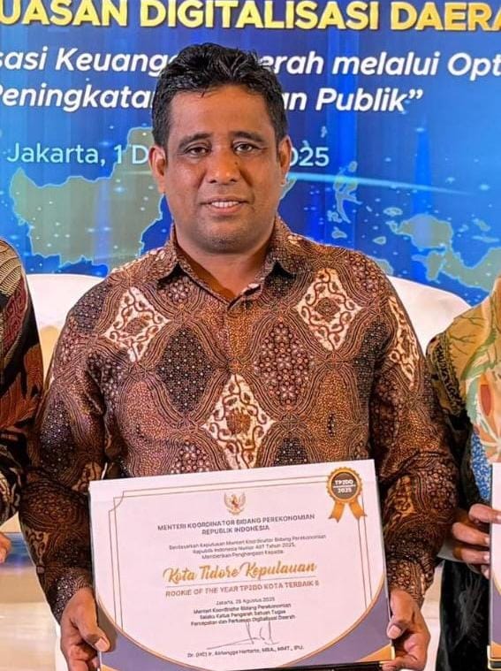 Senada, Kepala Bapperida Kota Tidore Kepulauan, Ir. Saiful Bahri Latif saat dikonfirmasi di ruang kerjanya, Senin (1/12/2025) mengatakan, Penghargaan yang diterima oleh Tim Percepatan dan Perluasan Digitalisasi Daerah (TP2DD) ini merupakan upaya untuk meningkatkan pelayanan yang prima dari Pemerintah Daerah Kota Tidore Kepulauan dan juga upaya untuk mengefisiensi penggunaan anggaran oleh Pemerintah Daerah.