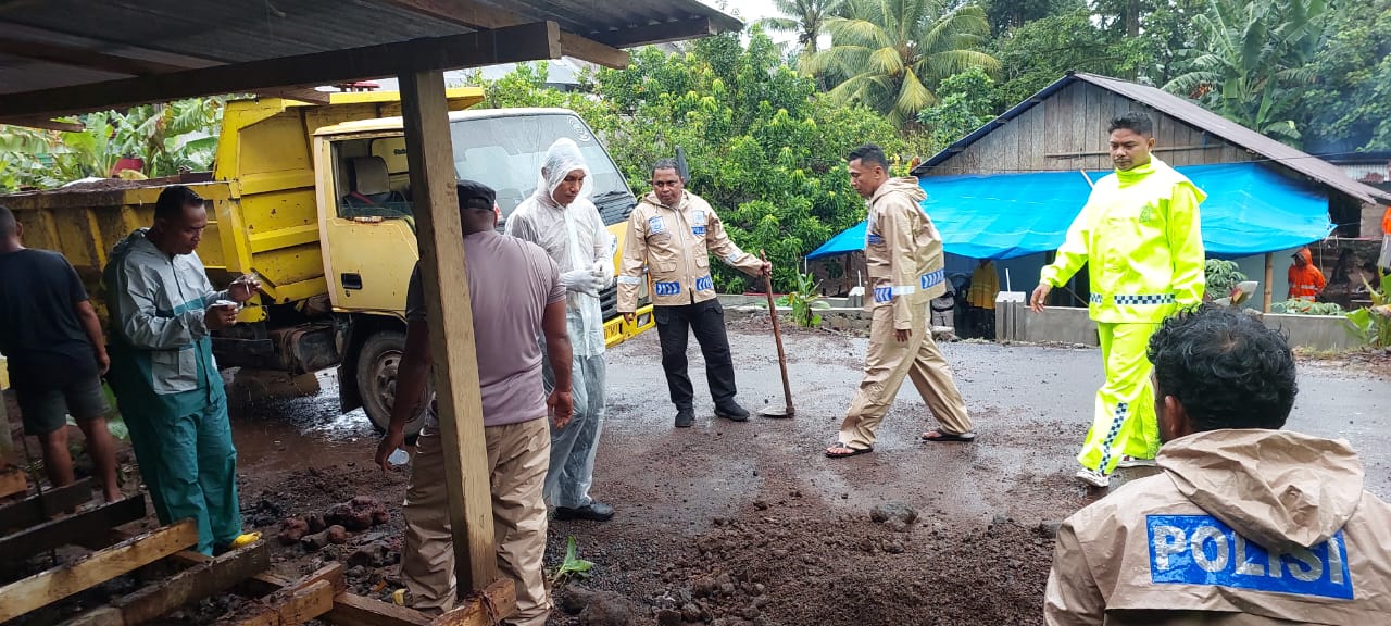 HALBAR – Aksi solidaritas dan pemulihan pasca banjir kembali digelar di Desa Taboso, Kecamatan Jailolo, Selasa (13/1). Personel gabungan bersama-sama masyarakat secara gotong royong membersihkan material lumpur dan sampah dari rumah-rumah warga yang terdampak, serta menguras saluran air dan gorong-gorong yang tersumbat.