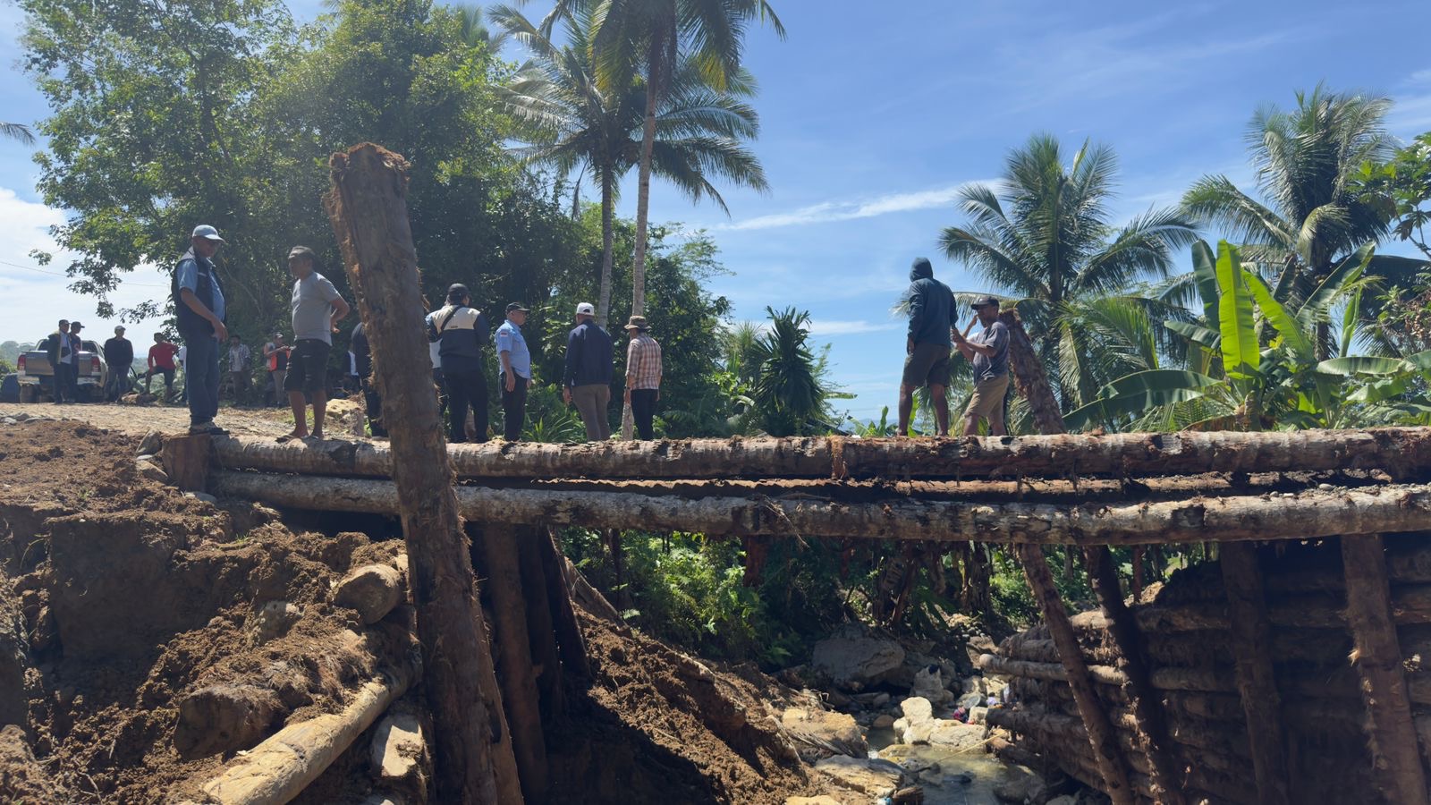 Pukul 13.10 WIT, tim tiba di ruas Jalan Posi-Posi yang longsor. Peninjauan difokuskan pada stabilitas lereng dan efektivitas penanganan sementara. Lima belas menit kemudian, rombongan mencapai Desa Pacao—lokasi jembatan yang putus total dan terseret banjir hingga ke laut.