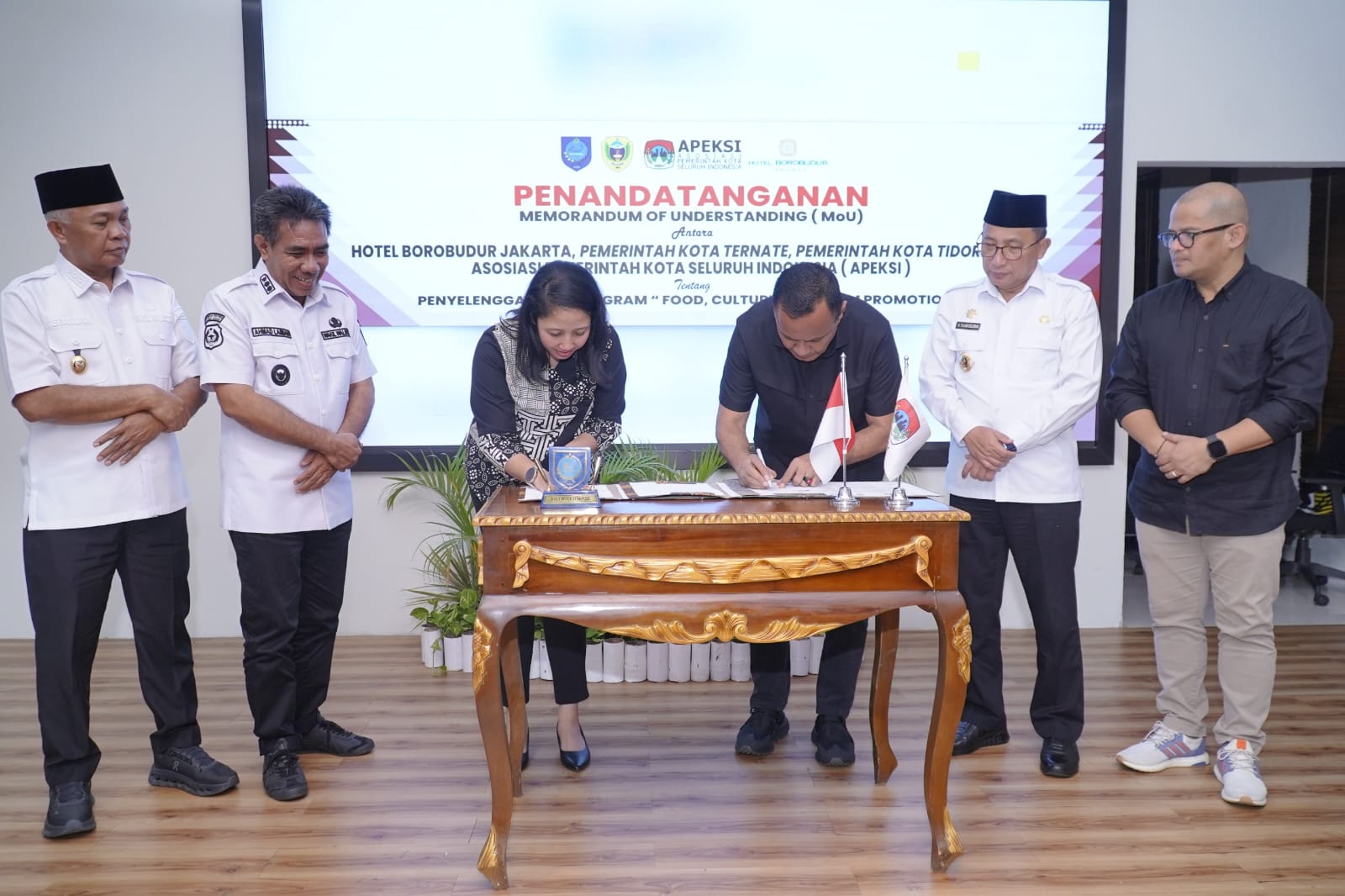 JAKARTA – Langkah besar untuk mendorong sektor pariwisata dan ekonomi daerah resmi dimulai, bertempat di Kantor Bappelitbangda Kota Ternate, Rabu (1/4/2026) Pemerintah Kota Tidore Kepulauan dan Pemerintah Kota Ternate resmi teken Memorandum of Understanding (MoU) dengan Hotel Borobudur Jakarta dan Asosiasi Pemerintah Kota Seluruh Indonesia (APEKSI) terkait penyelenggaraan program “Food, Culture & Tourism Promotion”.