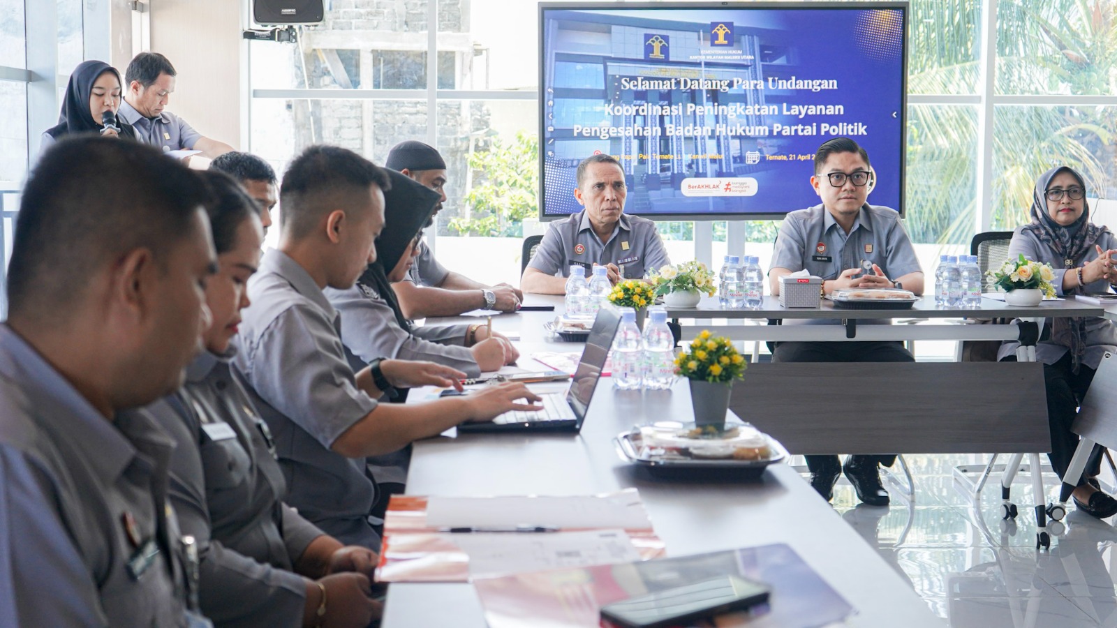 Ternate – Kantor Wilayah (Kanwil) Kementerian Hukum (Kemenkum) Maluku Utara (Malut) menggelar koordinasi peningkatan layanan pengesahan badan hukum partai politik bersama Direktorat Jenderal Administrasi Hukum Umum (Ditjen AHU) Kemenkum. Kegiatan ini menjadi bagian dari upaya penguatan sinergi antarinstansi dalam mewujudkan layanan administrasi hukum yang efektif dan akuntabel,
